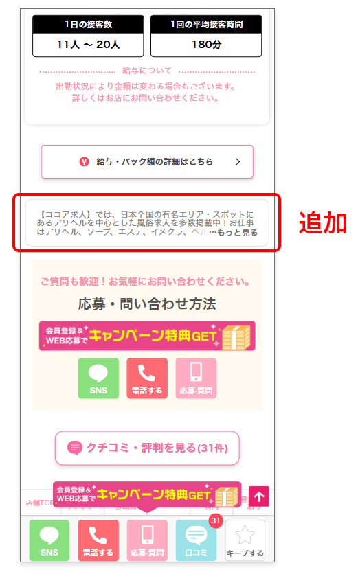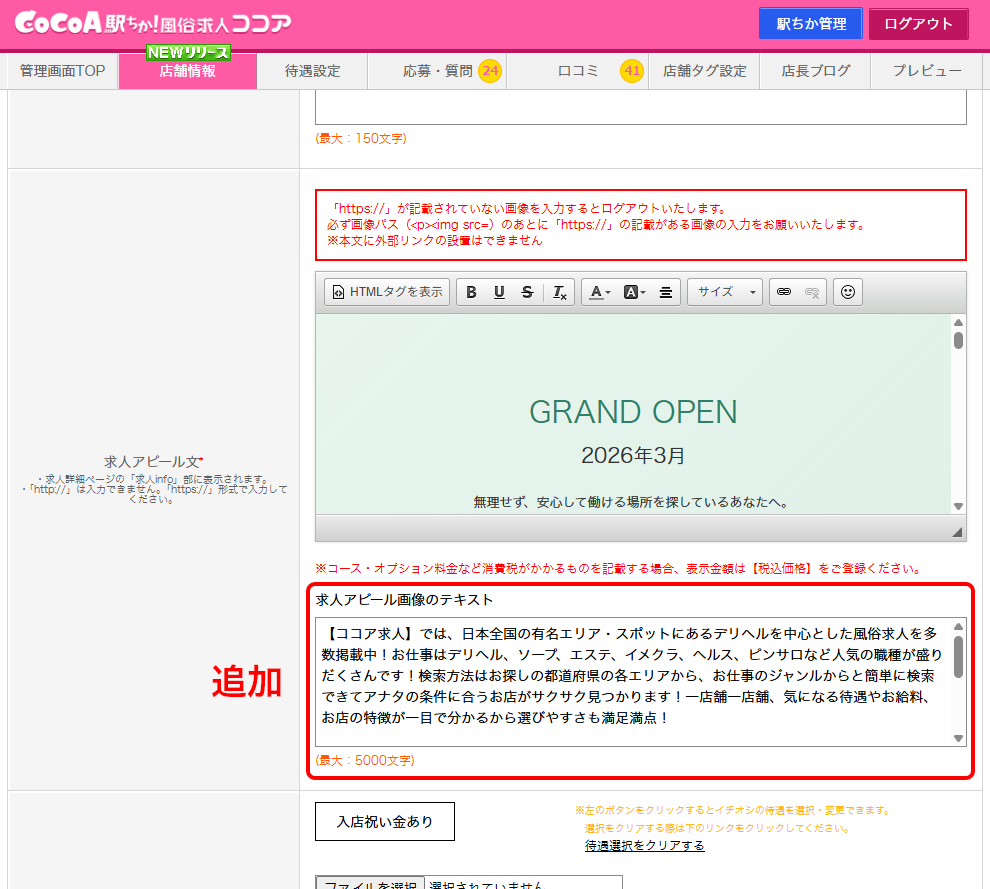 2026.03.23【ココア】求人メッセージ内画像のテキスト情報登録について 風俗求人求人メッセージ内画像のテキスト情報登録についてこの度、SEO対策として求人メッセージ内に使用されている画像に含まれる文字情報をテキストとして表示させる改修を実施いたしました。店舗詳細ページ内の情報量増加によるSEO向上および検索評価の安定化のための施策となりますので、ご理解のほど何卒よろしくお願いいたします。目次1 店舗詳細ページ2 管理画面店舗詳細ページ「ココア求人見た!」で の下部に追加管理画面求人アピール文登録フォームの下部に追加 2024.12.26 風俗求人 ココアhttps://cocoa-job.jp「駅ちか!風俗求人 ココア」は、全国の風俗求人情報を掲載するサイト。勤務時間・曜日を自由に...お知らせ【ココア】キャンペーン延長のご案内【ココア】大阪府 メンズエステSプラン 新規解放のご案内【ココア】大阪府メンズエステSプランと駅ちか箱店セットの料金について【ココア】特別待遇の運用・仕様変更のご案内 Post Share Line RSS note 【見えちゃっとTV】第56回イベントのお知らせ前の記事 【バニラ】「バニラポイント リニューアル」リリースのお知らせ次の記事